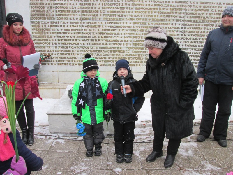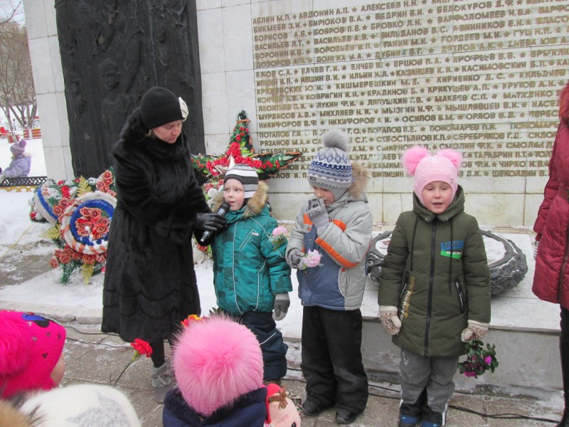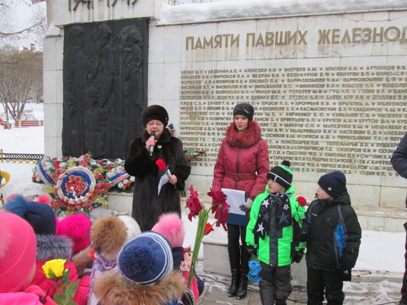 21 февраля у памятника павшим железнодорожникам, состоялось торжественное мероприятие, приуроченное празднованию Дня защитника Отечества. На мероприятие пришли воспитанники детских садов района ж/д вокзала, ветераны и жители города. Со словами поздравления к собравшимся гостям обратились: Председатель совета ветеранов Златоустовского региона Цветова Елена Васильевна, воспитатель детского сада № 193 Шилова Надежда Семёновна, которые поздравили всех присутствующих с наступающим праздником и пожелали всем мирного неба над головой.
