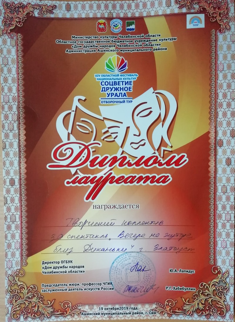 19 октября театральный коллектив и вокальный ансамбль «Радуга» Дома культуры успешно приняли участие в XIV областном фестивале национальных культур «Соцветие дружное Урала», посвященного Году театра в России. В рамках фестиваля театральным коллективом был показан спектакль «Вечера на хуторе близ Диканьки» по мотивам одноименной повести Н.В. Гоголя, вокальным ансамблем исполнена песня «Калина-рябина». По результатам коллективы получили Дипломы лауреата.