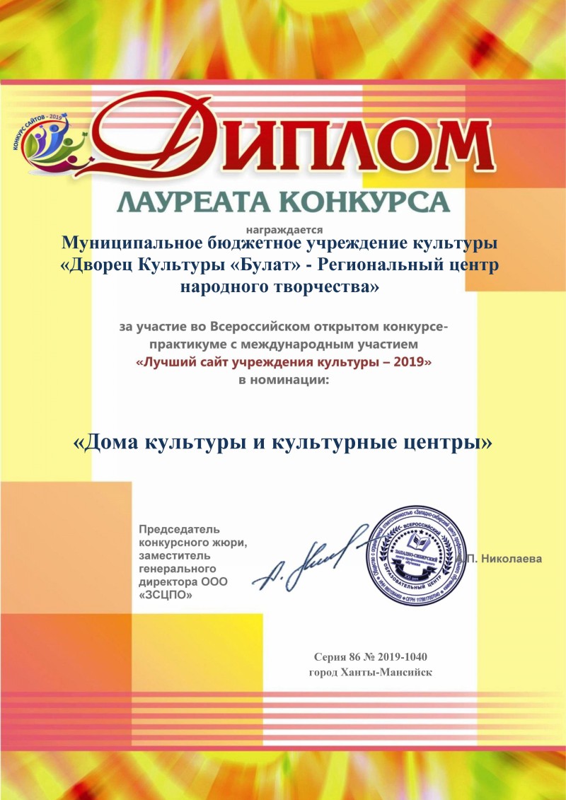 В 2019 году ( с 15.09. по 15.12.) МБУК «ДК «Булат»- РЦНТ» принял участие во Всероссийском конкурсе по ведению сайтов организаций системы культуры «Лучший интернет-сайт учреждения культуры -2019», который организовал и провел Западно-Сибирский центр профессионального обучения, с прохождением курса обучения по ведению сайта. После подведения итогов 31 декабря Дворец культуры «Булат» стал лауреатом Всероссийского конкурса-практикума.