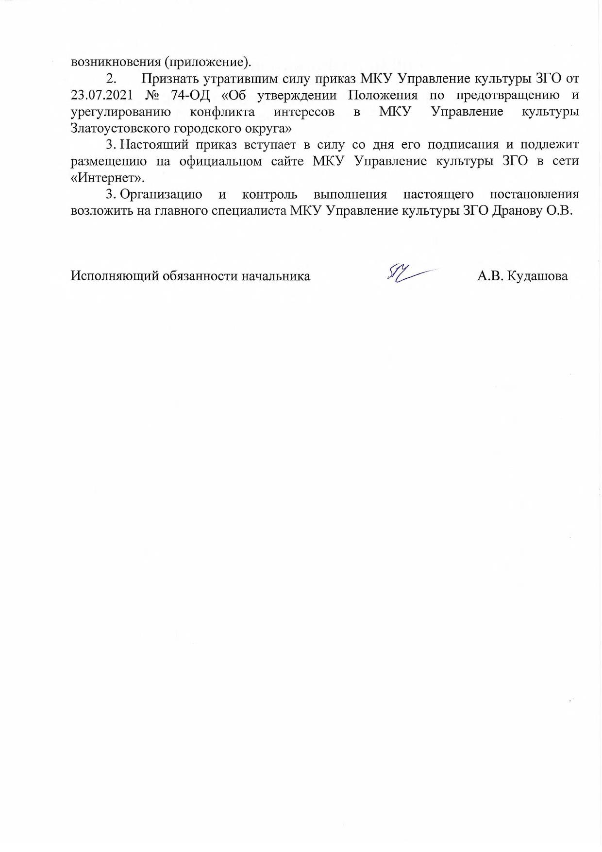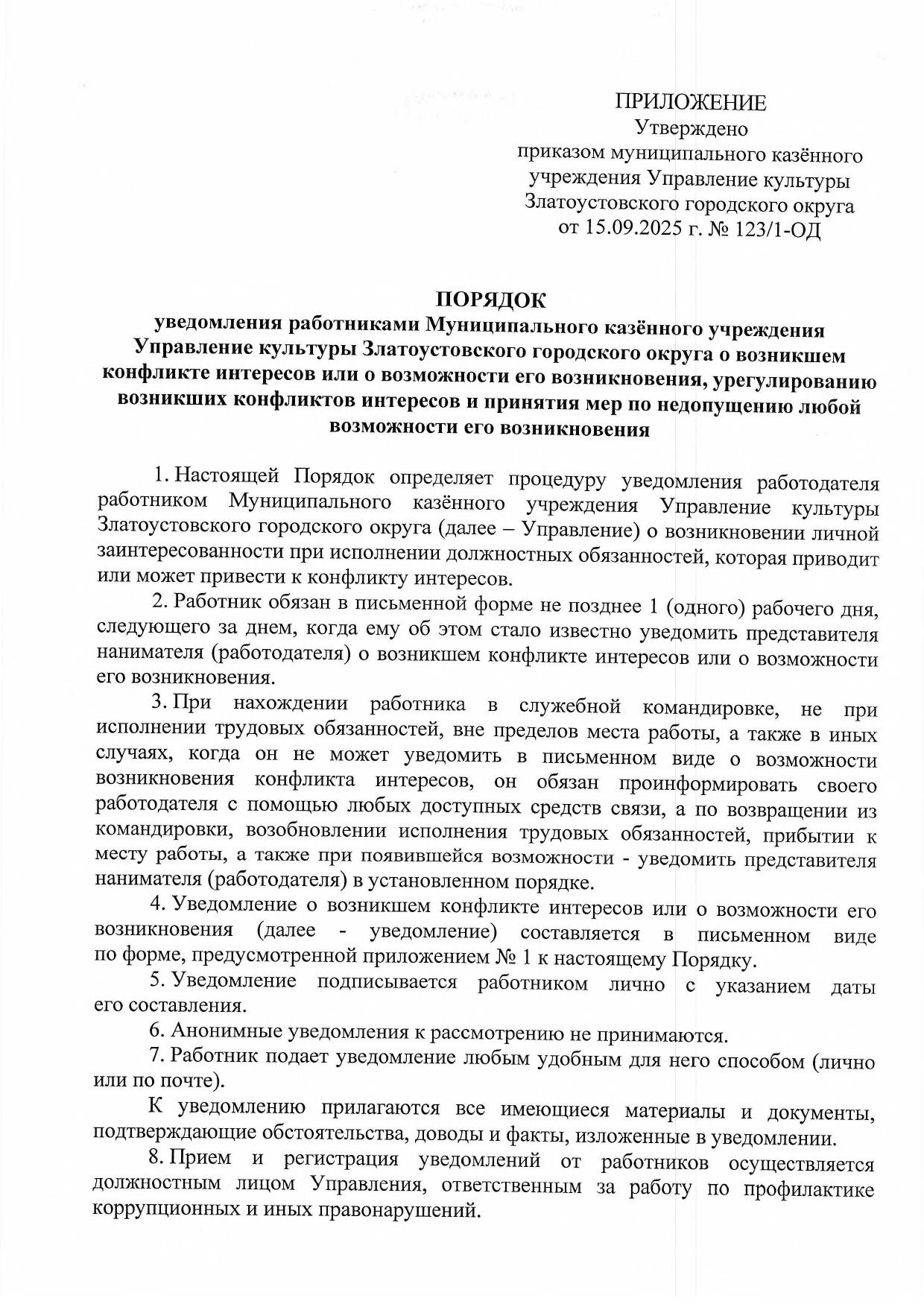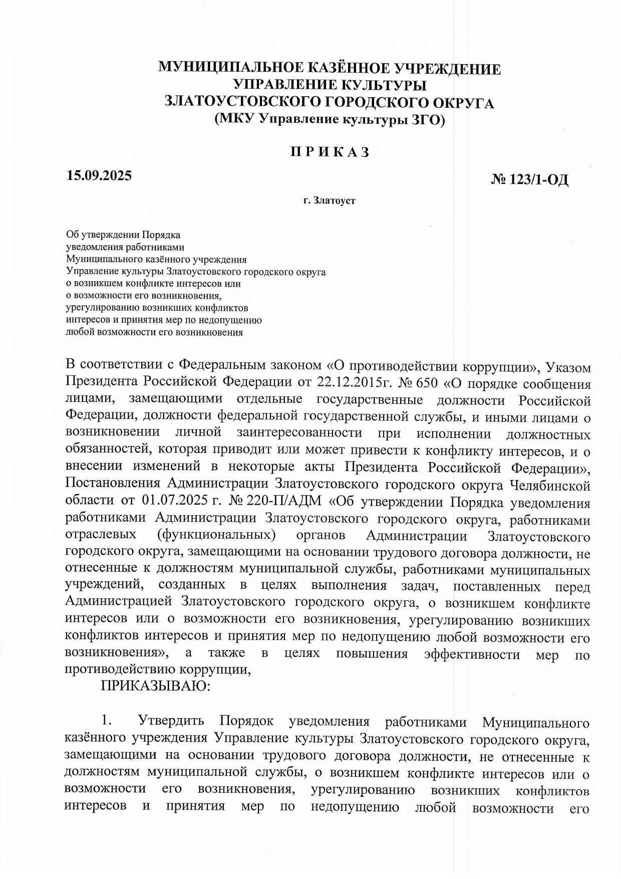 Приказ № 123/1-ОД от 15.09.2025 Об утверждении Порядка уведомления раотниками МКУ УК ЗГО о возникшем конфликте интересов или возможности его возникновения, урегилированию возникших конфликтов интересов и принятия мер по недопущению любой возможности ...